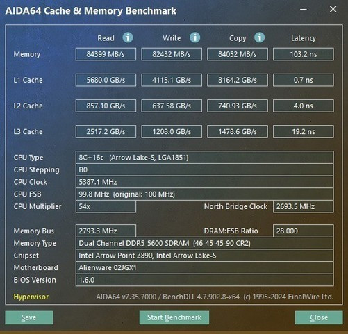 内存方面,2x32GBDDR55600MT/s内存基本可以突破现有的内存瓶颈,AIDA64内存性能测试可以看到,其读取速度为84399MB/s,写入速度为82432MB/s,拷贝速度为84052MB/s,延迟为103.2ns,性能表现相当不错,而且延迟控制算是比较低的,整体内存性能不存在任何问题。