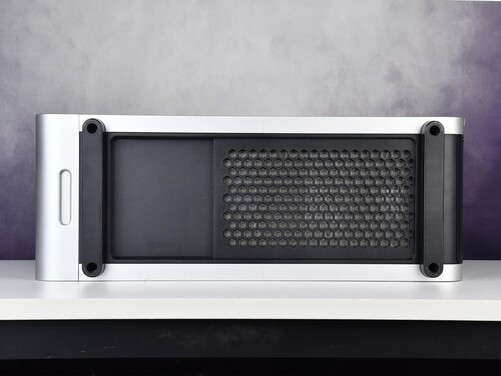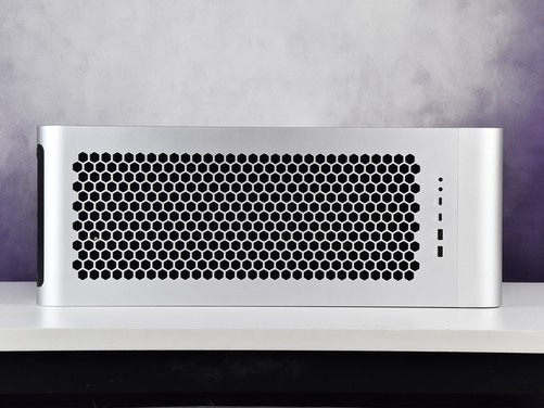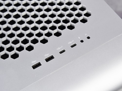 机箱底部前后两端配有脚垫,可以让机身底部与桌面之间留出足够的缝隙,也能够保护底面不被磨损。底部靠后方的电源区域同样也设计了蜂巢状六边形格栅,有助于提升散热效率。