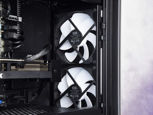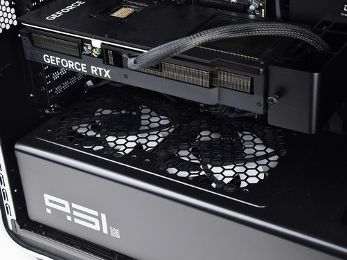 机箱顶部配置了360冷排的散热风扇,可以看到风扇滤网朝向机箱内部,这也意味着顶部风扇为向机箱内吹风设计,之后再由机箱前端风扇将热风全部吹向机箱后端排出热量。