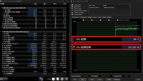 在默认频率和电压设置下,通过AIDA64FPU的CPU单拷机测试可以看到,其CPU封装功耗最高为241W,CPU封装温度平均为86℃,相对于13、14代酷睿250W以上的拷机功耗和100℃以上的核心温度而言要好上不少,而且Area-51这套散热系统的效率极高,温度比酷睿Ultra9285K首测时更低,可见Area-51通过内部增压的方式将热风集中排出的创新设计,确实是行之有效。