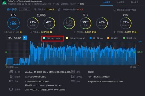 首先是电竞游戏,我们选择了对硬件要求比较高的《三角洲行动》,开启极致画质后,2K分辨率平均帧率166fps,非常流畅。另外对于电竞游戏来说,更加重要的1%Low帧表现也很出色,平均为101fps,画面不会出现突然的卡顿或迟滞,整体体验非常流畅。而且画质拉满之后,这款游戏的体验更加出色。