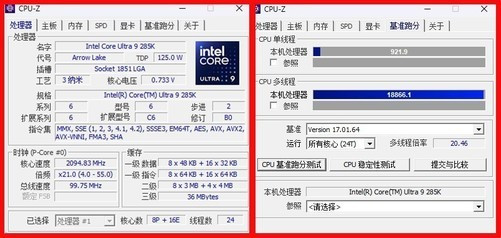 规格方面,酷睿Ultra9285K采用24核24线程设计,睿频加速最高为5.7GHz,基础TDP为125W,最大TDP为250W。CPU-Z单核和多核性能分别为921.9以及18866.1,这个分数与首发时的测试分数一样,说明Area-51的散热设计足够出色,并未影响到这颗处理器的性能跑分,总体功耗释放也足够充分。