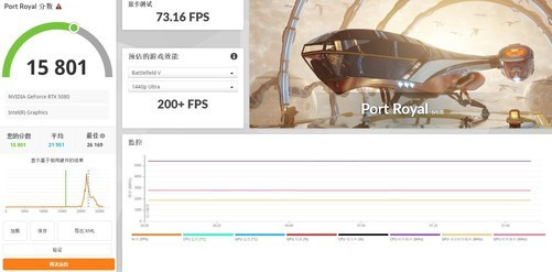 PortRoyal光追性能,1440p分辨率《战地V》预估游戏性能,平均帧数达到了73.16fps,光追性能评分达到15801;