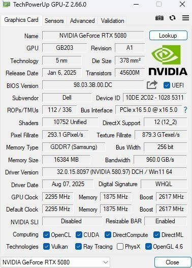 显卡方面,Area-51配备了定制款RTX5080,根据GPU-Z检索的相关参数来看,这款显卡拥有10752个CUDA核心,16GBGDDR7显存,总线带宽256bit,带宽速率960GB/s,像素填充率293.1GPixel/s,纹理填充率为879.3GTexel/s,光栅单元和纹理单元为112/336,核心频率2295MHz,显存频率1875MHz,Boost频率2617MHz。测试时我们使用的驱动版本为580.97。