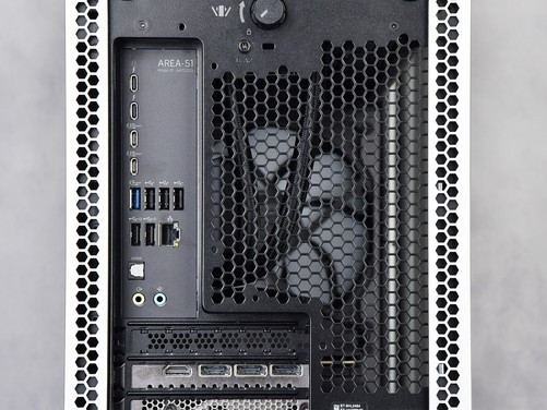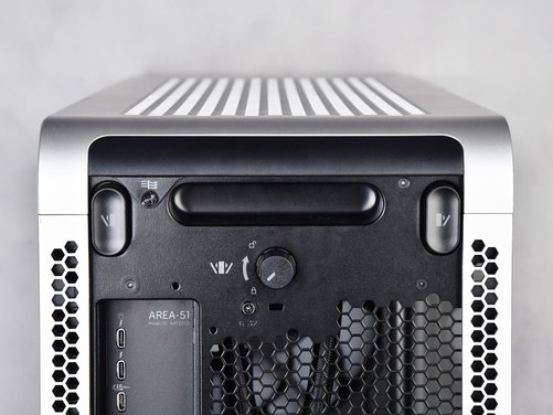 机箱顶部是大面积的蜂巢状六边形通风格栅,不过机箱内的热风并不是从这里排出,而是向内集中后由机箱后方排出。这样的设计对于将机箱放置在桌面下方的用户来说非常合适,可以显著规避向上出风对用户的影响。此外根据Alienware外星人官方数据来看,Area-51这套正在申请专利技术的集中热量后再排出的设计,通风量相较往代增加了25%,散热效率显著提升。