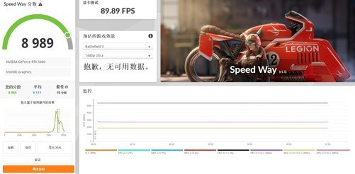 SpeedWayDX121440p分辨率《战地V》预估游戏性能,平均帧数为89.89fps,图形性能评分8989,表现相当不错;